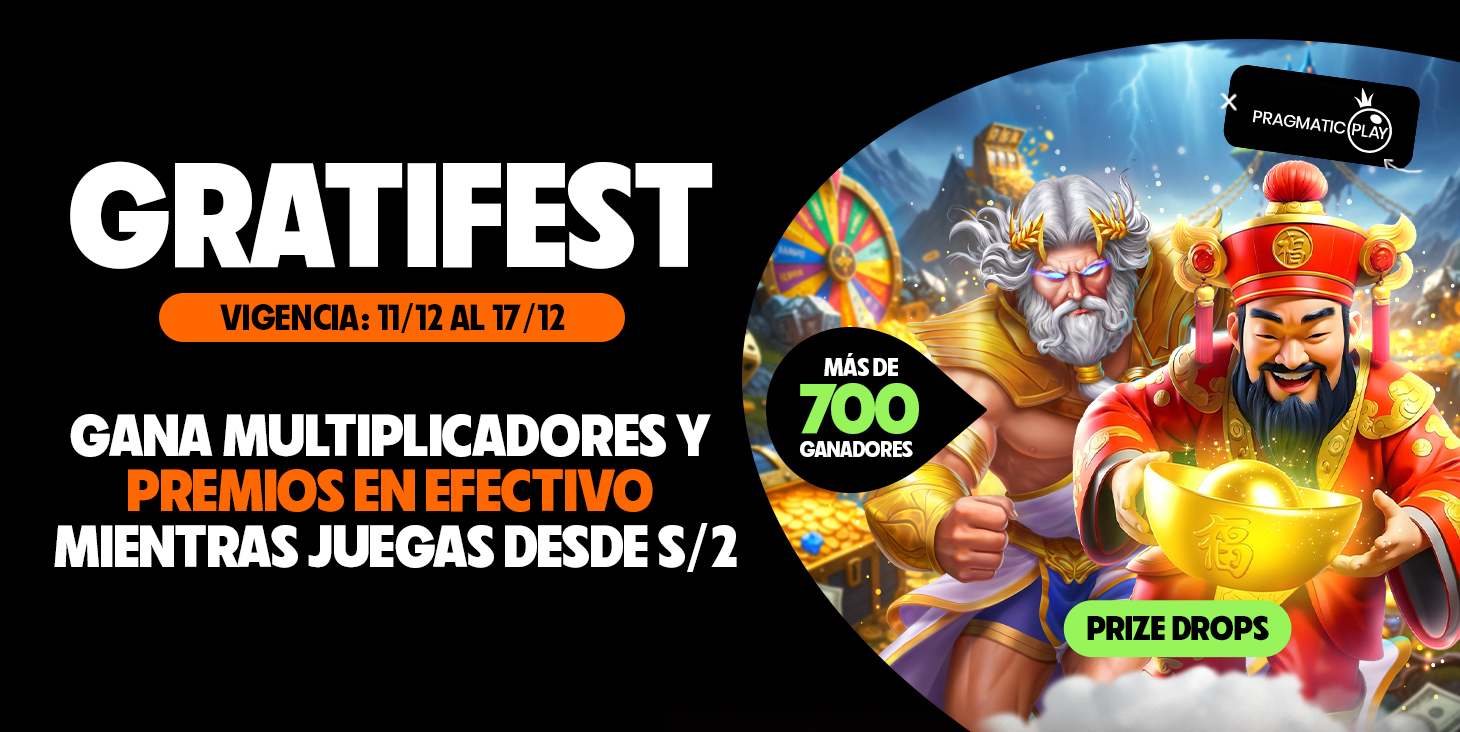 La Promoción Gratifest cuenta con un pozo total de S/.16,300 en premios, dividido en premios de multiplicador de apuesta o efectivo durante la vigencia de la promoción.
