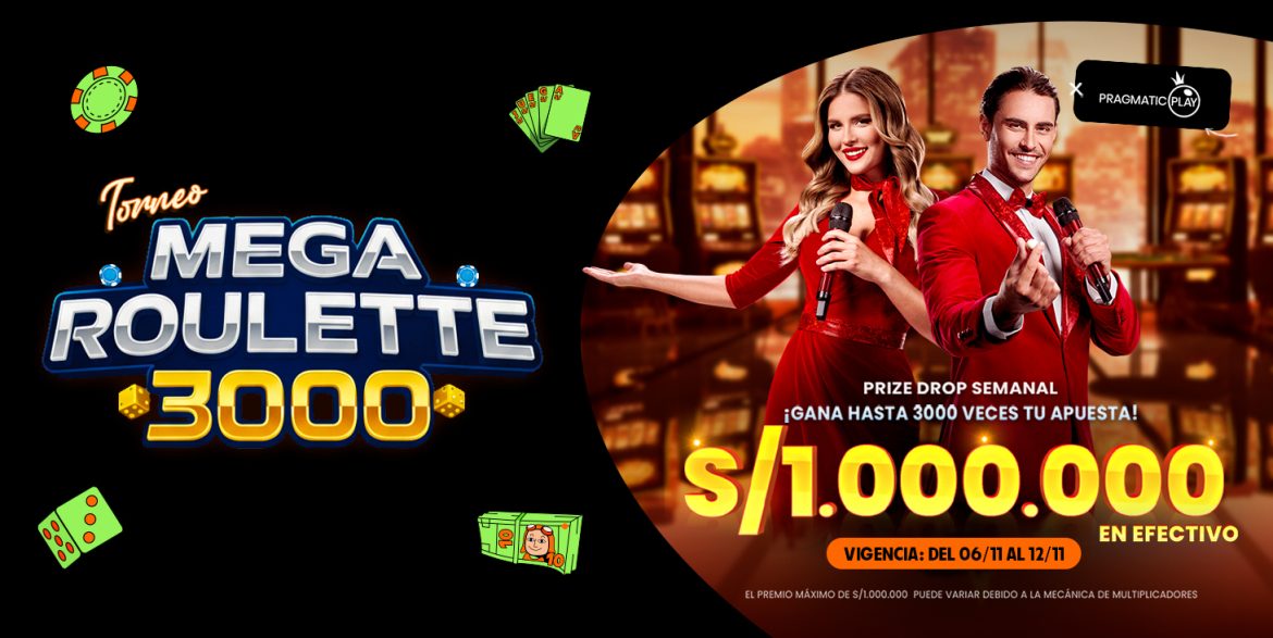 El Torneo Mega Roulette 3000 cuenta con un pozo total de S/.1,000,000 en premios, dividido en multiplicadores y/o prize drops.